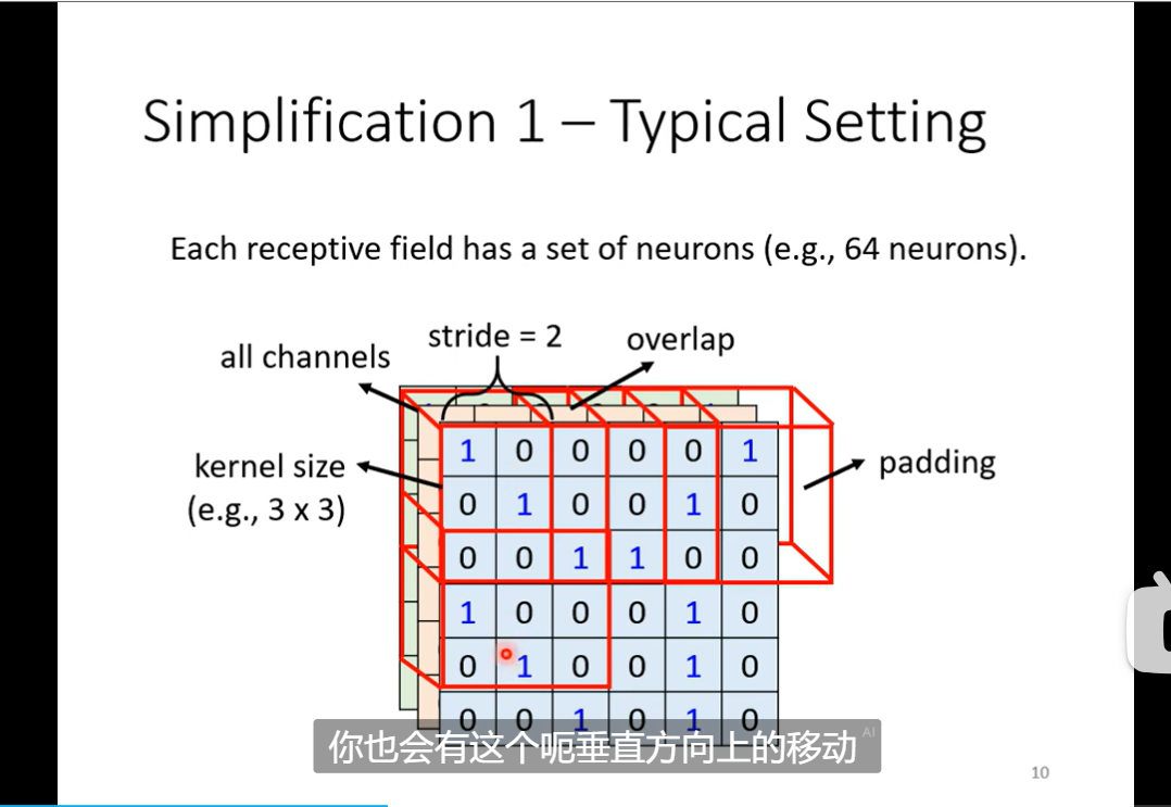 - 一般通常选取都是三个channel 然后此时的长宽称为kernel size 3X3 通常就可以了 stride hyper para 超出的部分进行padding