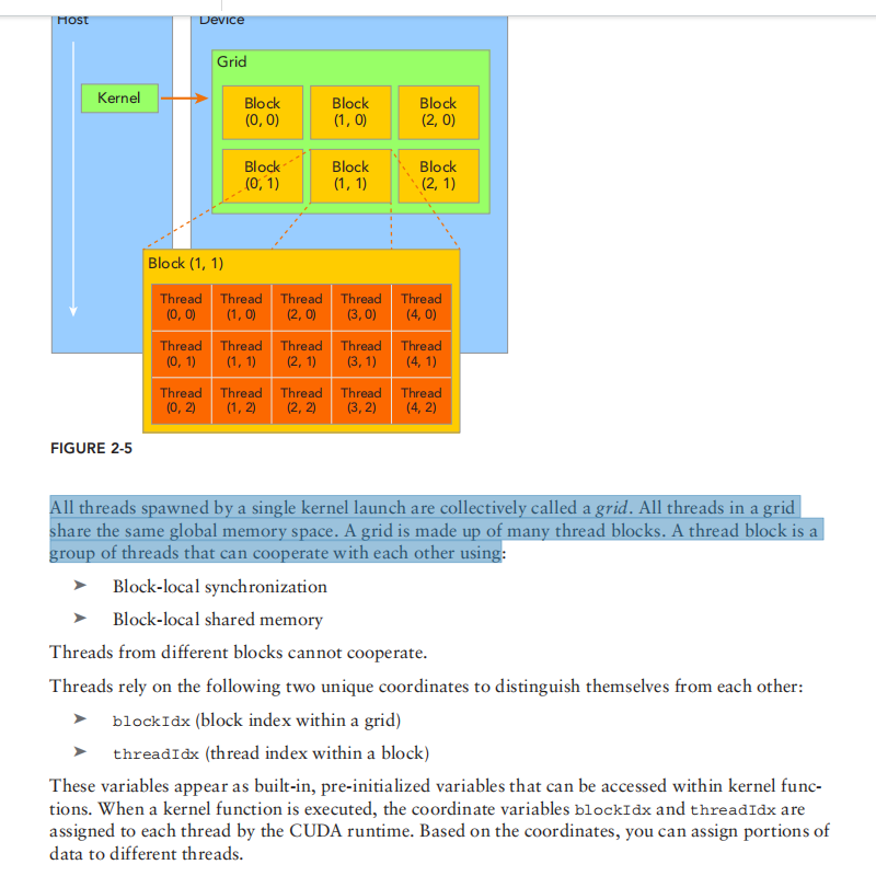 - kernels 就是device code 里的并行函数由 nvcc 编译 nvcc 会区分host code and device code 然后就是完全分开执行 good