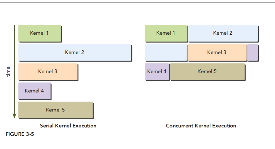 - Fermi also supports concurrent kernel execution: multiple kernels launched from the same applicationtion context executing on the same GPU at the same time. Concurrent kernel execution allows programs that execute a number of small kernels to fully utilize the GPU, as illustrated in Figure 3-5. Fermi allows up to 16 kernels to be run on the device at the same time. Concurrent kernel execution makes the GPU appear more like a MIMD architecture from the programmer’s perspective.