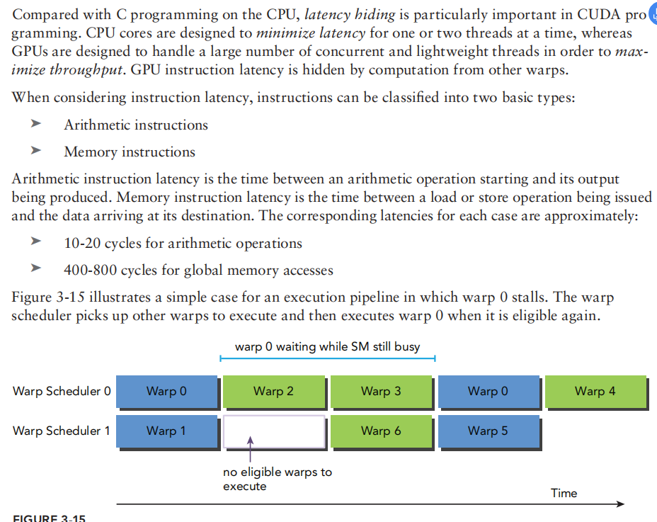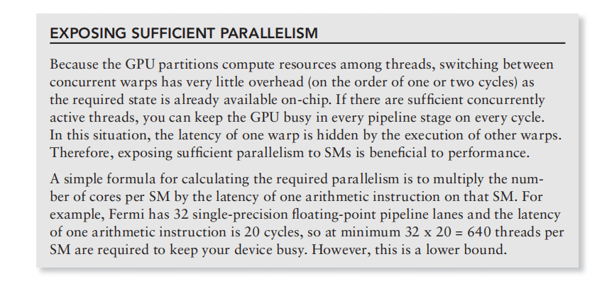 - latency hiding  类似于CPU的调度 latency就是时间 一般用clock cycle 计算大小 类似于CPU的调度 latency就是时间 一般用clock cycle 计算大小- P91 有趣的排队理论 就是需要同时并行的操作数=延迟(cycle)*预期throughput throughput 与 bandwidth used interchangably bandwidth refer to as peak data transfer per time unit throughput refer to as any operations rate metrics都是throughput单位 ops per cycle per SM 也可以进一步用warps表示也就是/32 so the underlying thing of latency hidding is that you should increase the parallesiem to move like sequential ops without waiting