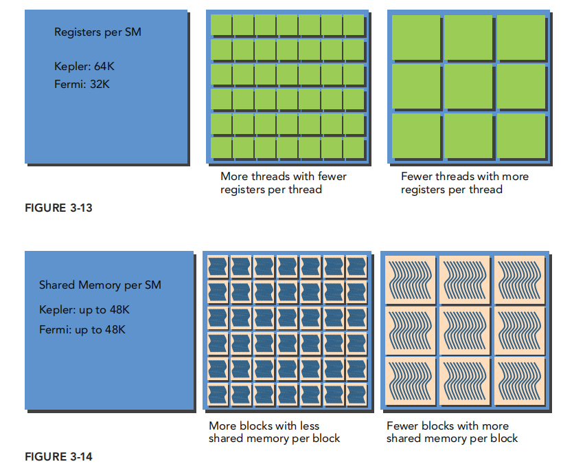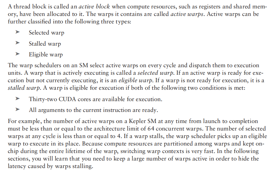 - P89 A thread block is called an active block when compute resources, such as registers and shared memory, have been allocated to it. The warps it contains are called active warps. Active warps can be further classifi ed into the following three types: 三种 selected warp stalled warp eligible warp selected 不多于4个 是不是类似于我所说的流水线 4个选项