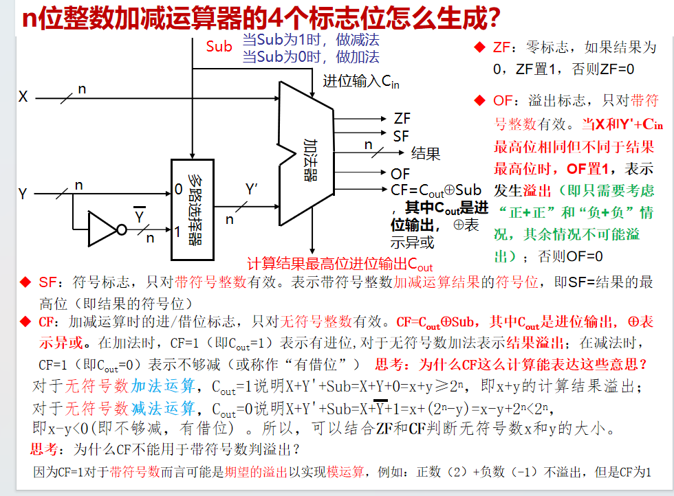 - 基于位运算的认识,以及补码,无符号有符号运算的认识,我们可以设计加法器,这个也正式引入一些控制信号,ZF CF OF SF。在汇编语言中我们也会再次见到 这四个标志位的设置非常简洁巧妙